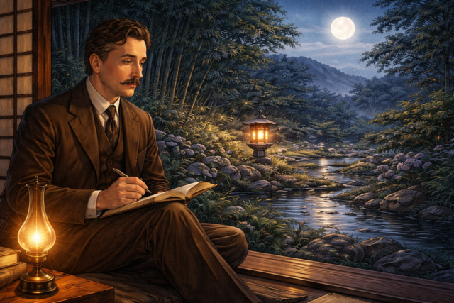 異国の地・日本で過ごす主人公(ヘブン)が寝室に入ると、布団のまわりに「蚊帳(かや)」が吊られている……。言葉の壁の中で、絵で使い方を記した女中・トキの心遣いにヘブンが心動かされ、蚊帳の中でそっと目を閉じる。
